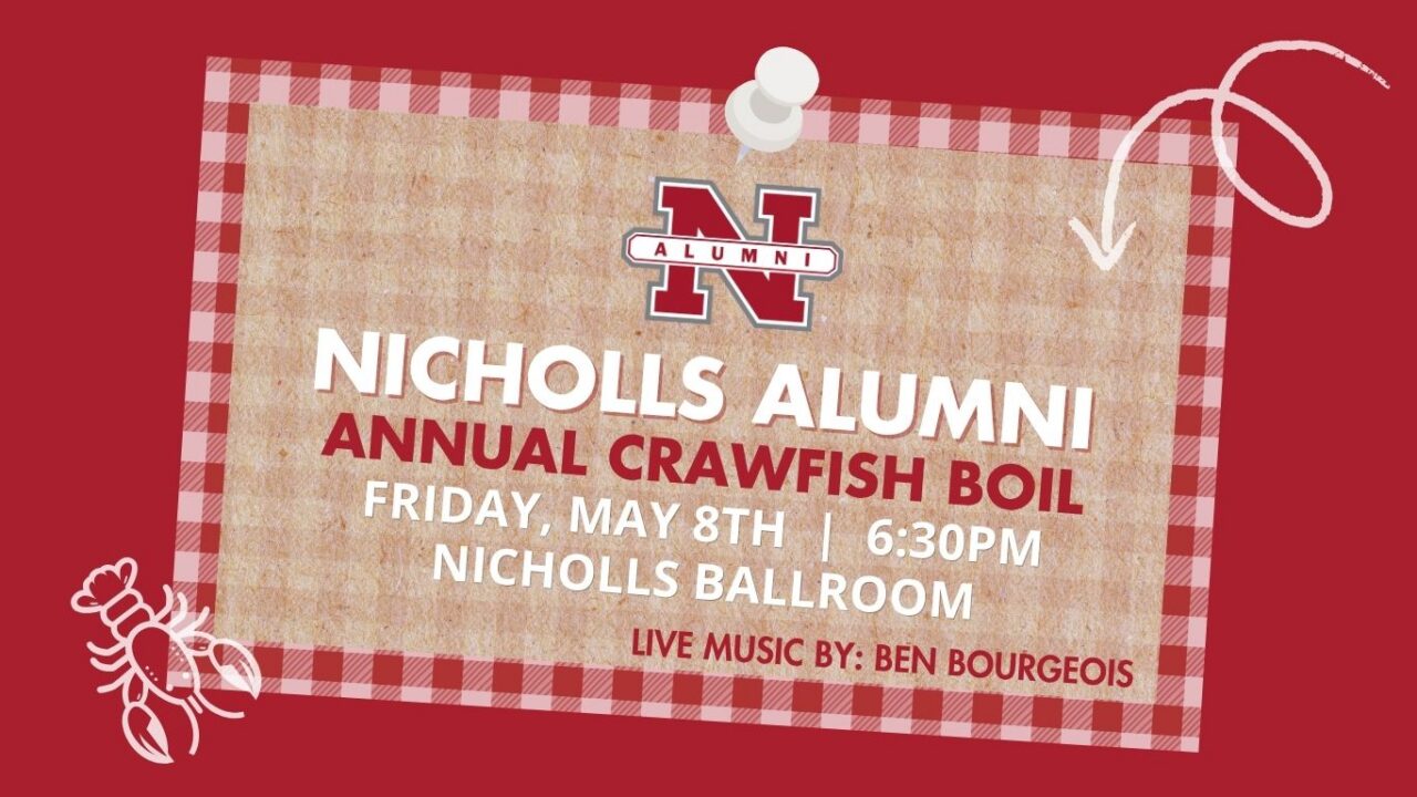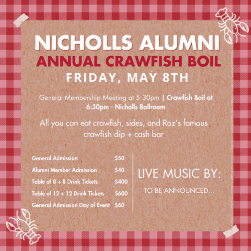 The Annual Alumni Crawfish Boil will be held on Friday, May 8th, 2026 in the Nicholls State University Ballroom.
